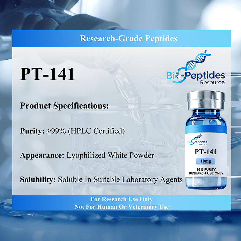 PT-141 Injections consist of a synthetic cyclic heptapeptide analog of α-melanocyte-stimulating hormone (α-MSH), produced through controlled peptide synthesis. Each batch is structurally characterized and prepared as a sterile solution or lyophilized powder intended for reconstitution prior to use in laboratory research. PT-141 is formulated for controlled experimental settings to investigate melanocortin signaling, central regulation of sexual behavior, and neuroendocrine pathways. It is supplied in a form suitable for injection studies to support precise dosing and delivery in analytical and cell/tissue-based research models.