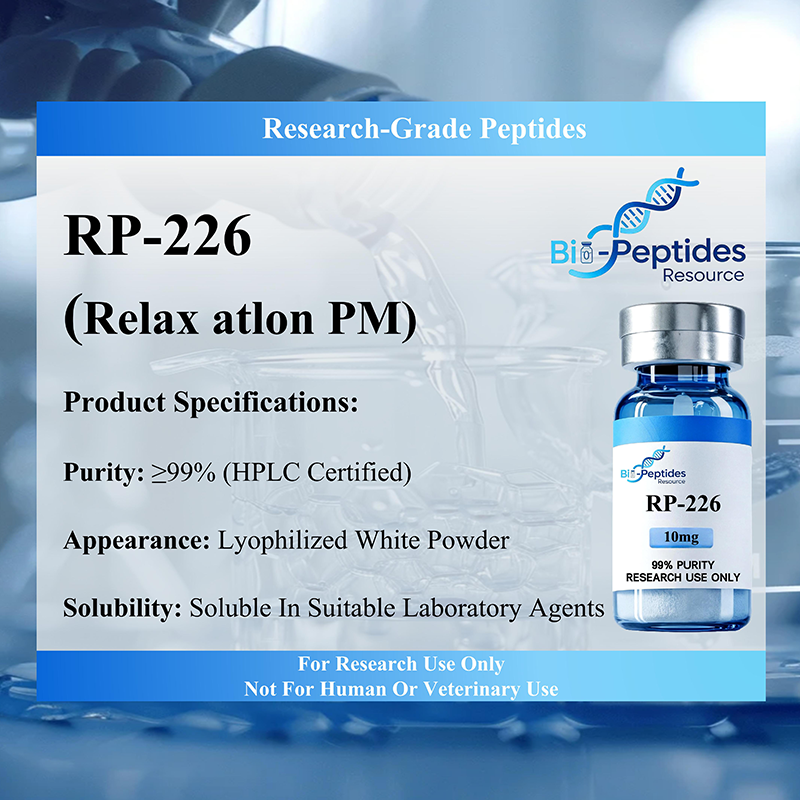 RP-226 10ml is a proprietary research blend formulated with a synergistic combination of compounds targeting sleep physiology and relaxation pathways. It includes Melatonin for circadian rhythm regulation, GABA for calming the nervous system, Arginine as a nitric oxide precursor to support blood flow and hormone release, and Glutamine for muscle repair and immune support. This advanced formulation is designed for controlled laboratory research to investigate sleep architecture, stress response, neurotransmitter balance, and nighttime recovery processes. It is supplied as a ready-to-use liquid solution in a 10ml vial to ensure stability and precise dosing in experimental settings.